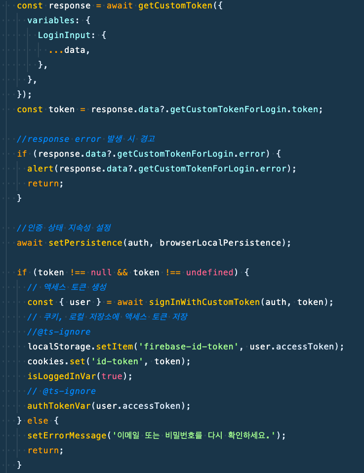 그리고 토큰이 있다면 signInWithCustomToken을 이용해 파이어 베이스에서 id token을 발급 받고 로컬스토리지에 저장한다