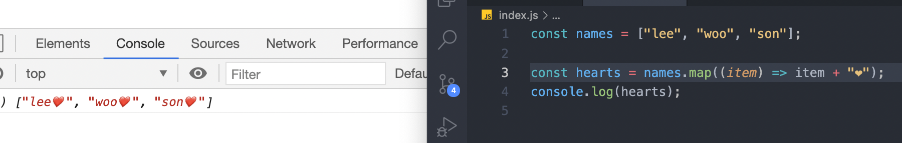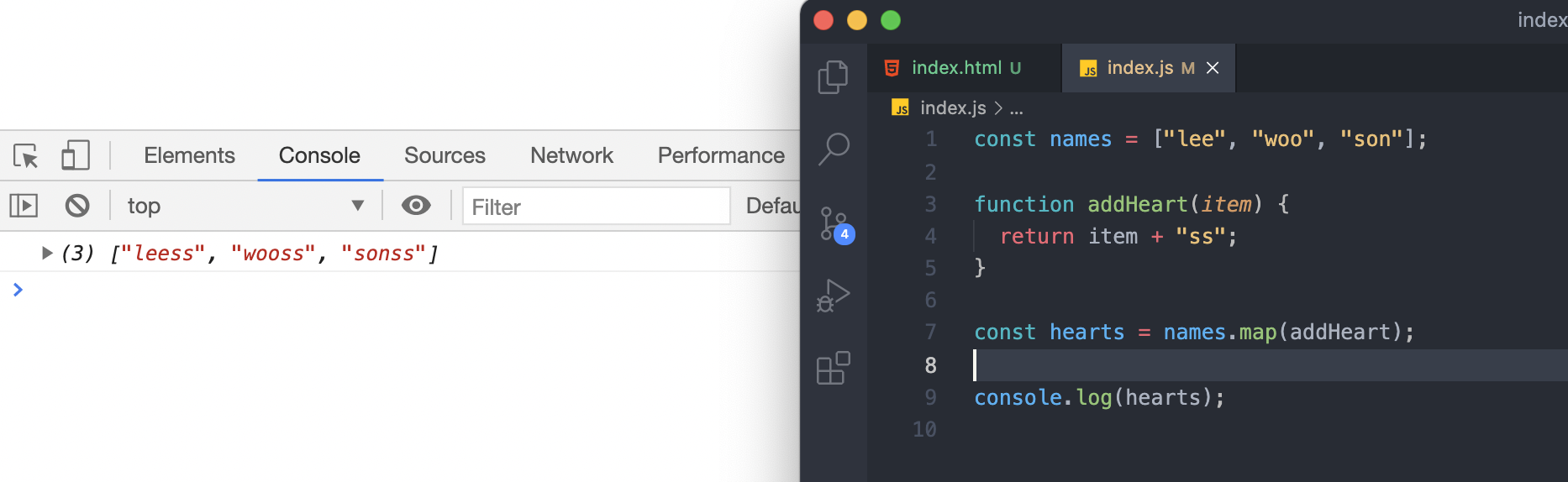다시 설명하자면 names에 모든 요소에 function을 각각 적용시켜주고 적용된 값들로 다시 배열을 만들어 hearts변수에 담아 줬다.
