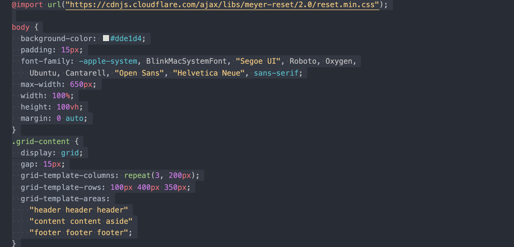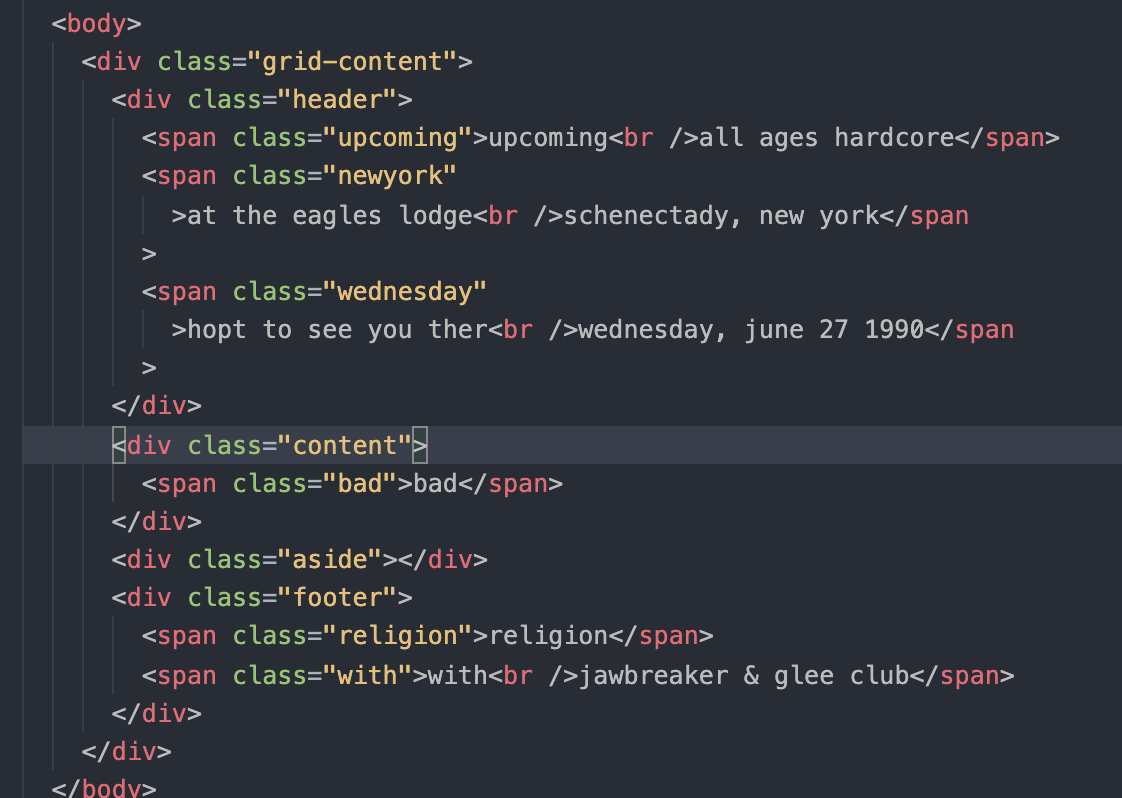 일단 큰 그리드박스를 만드려고 하나의 grid-content를 만들고 그 안에 header, content, aside, footer를 만들었다.