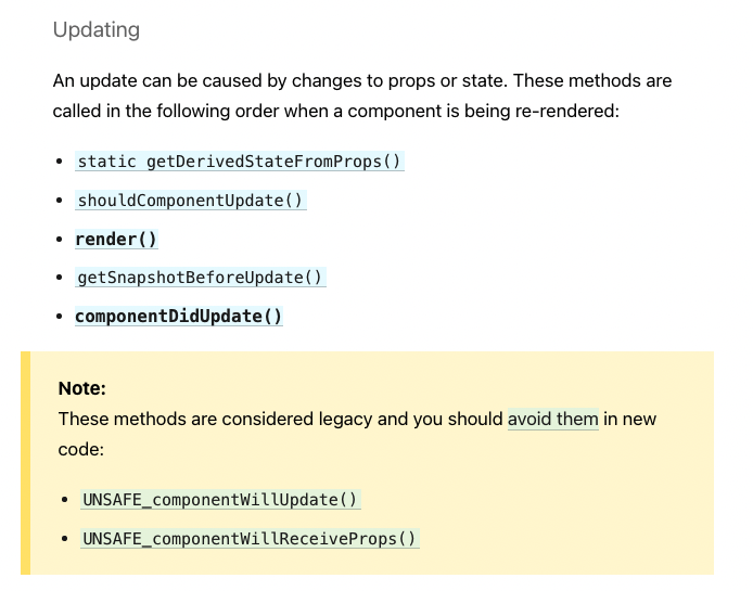 업데이트는 props or state의 변화에 따라 일어난다. 그리고 역시 function들이 있는데 이 또한 순서대로 호출 된다.