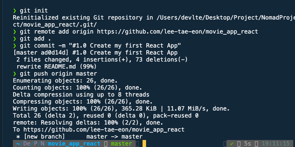 설치가 완료되었고 git init을 해주고 깃헙에 레포지토리 만들어준뒤 커밋하고 등록했다