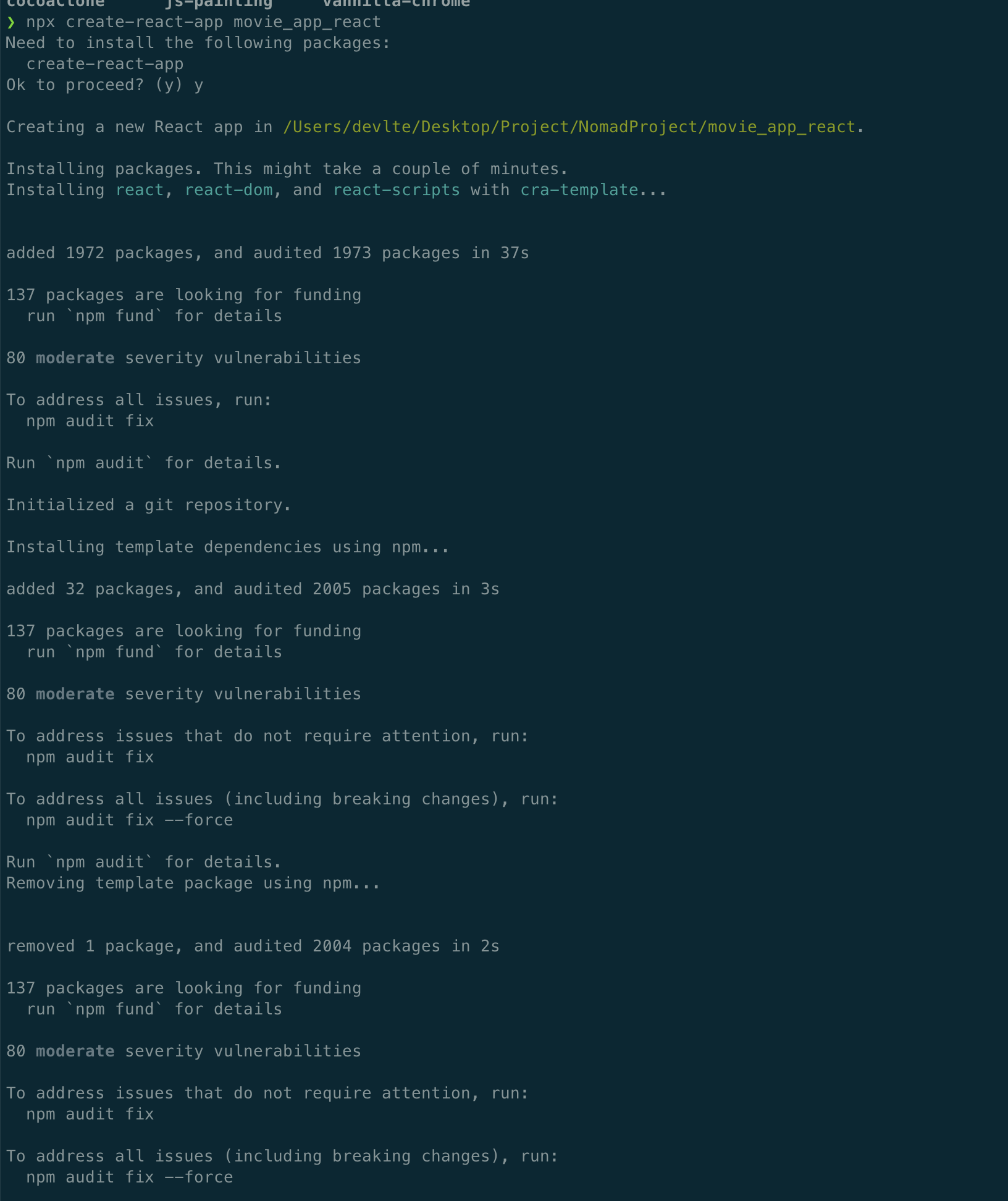 우선 create-react-app으로 초기 설치 할 것을 모두 설치해주는데 먼저 npm install npx로 npx를 설치한뒤