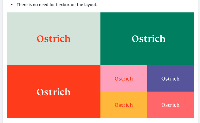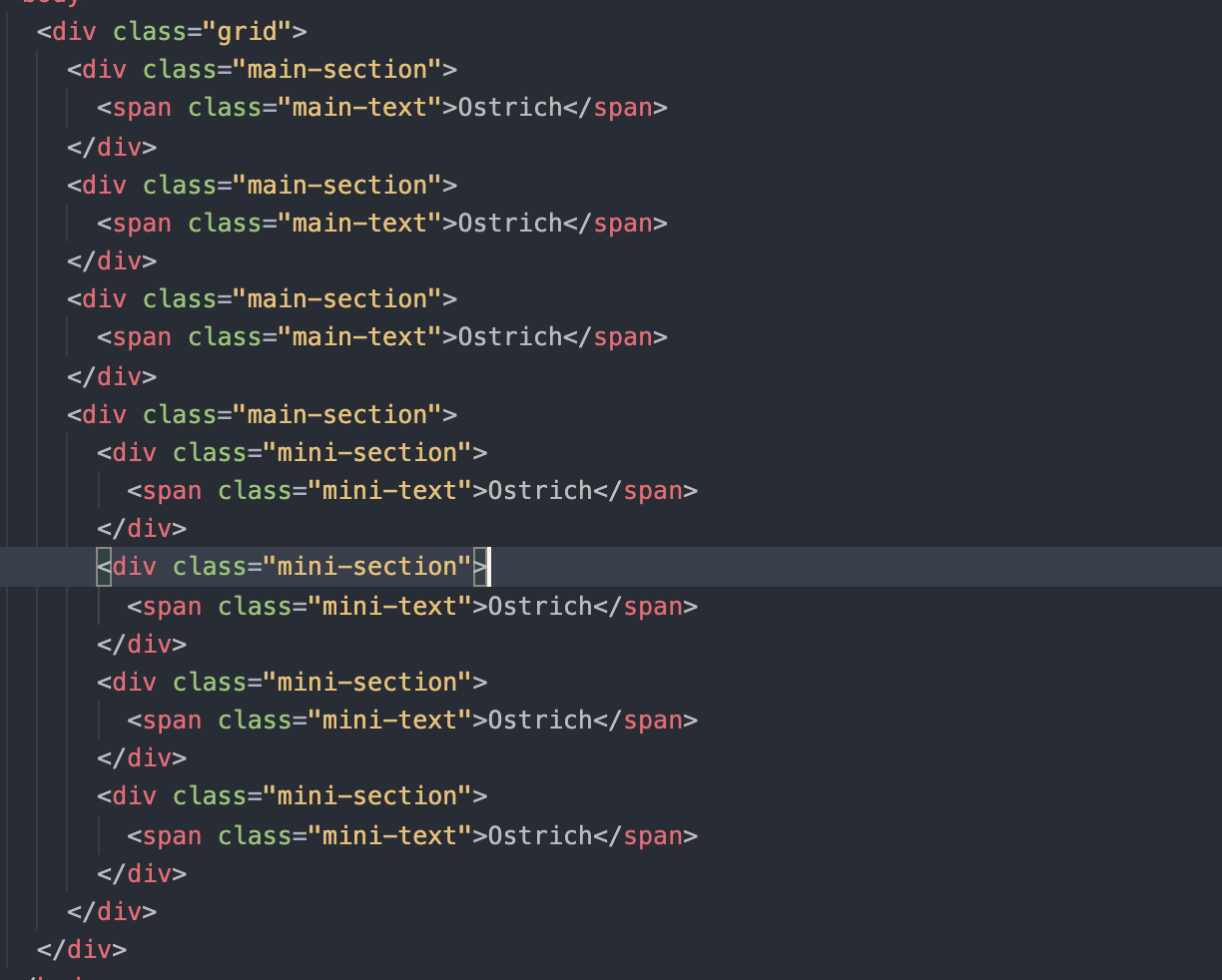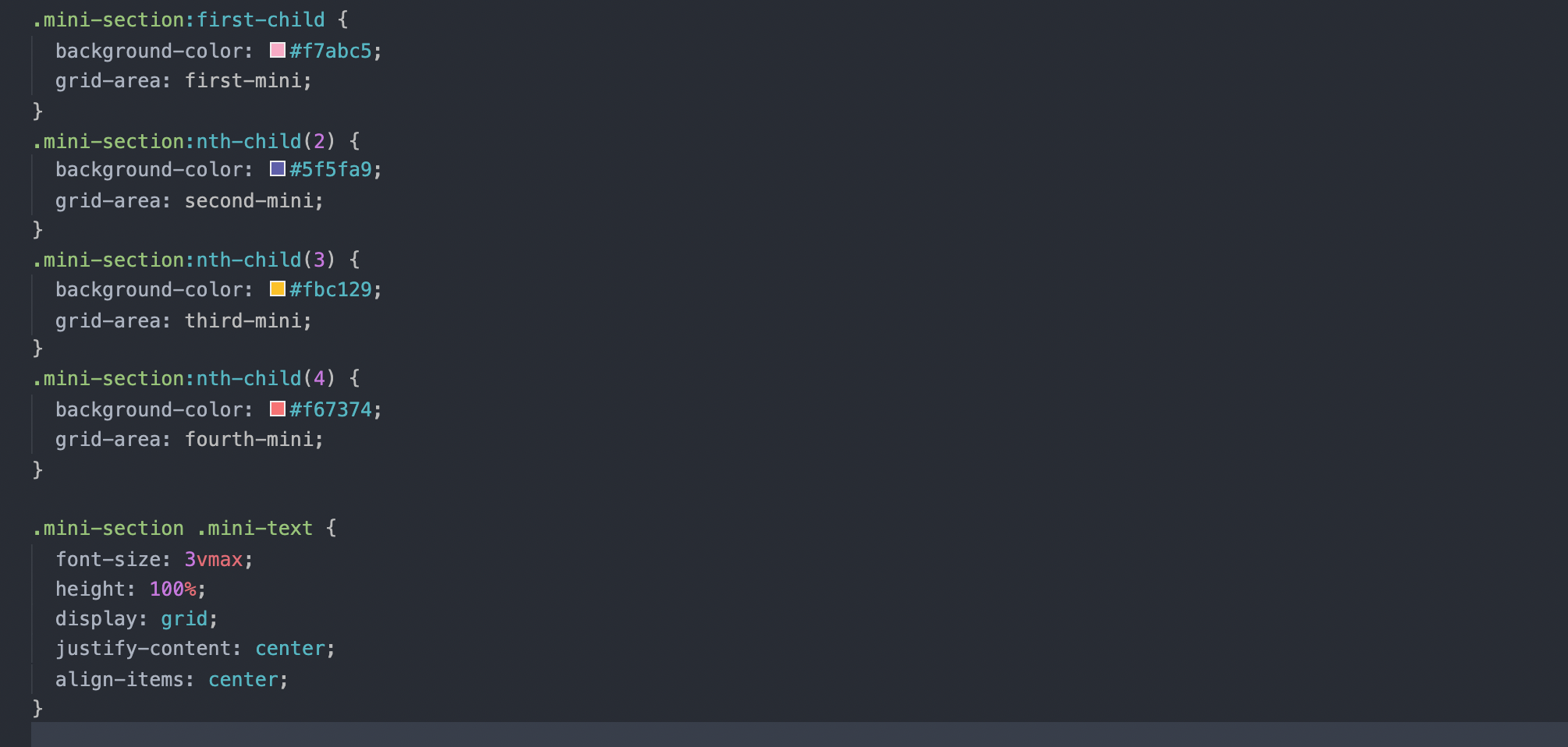 이제 마지막으로 미니 섹션 부분도 역시 마찬가지로 색상 지정해주고 grid-area 영역을 지정해줬다.