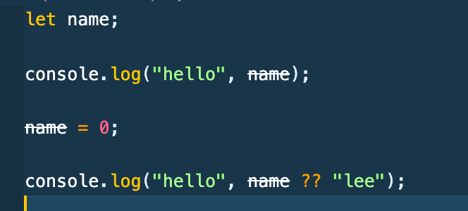 0이 제대로 출력됨을 볼 수 있다. 이는 ?? 연산자는 왼쪽피연산자가 null이거나 undefined일때만 왼쪽피연산자를 반환한다.