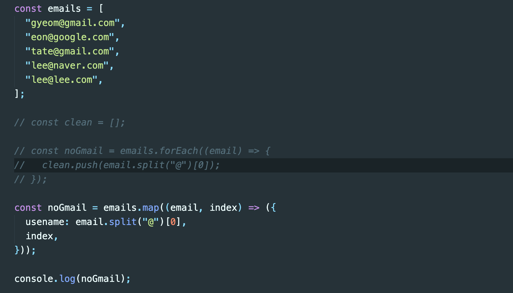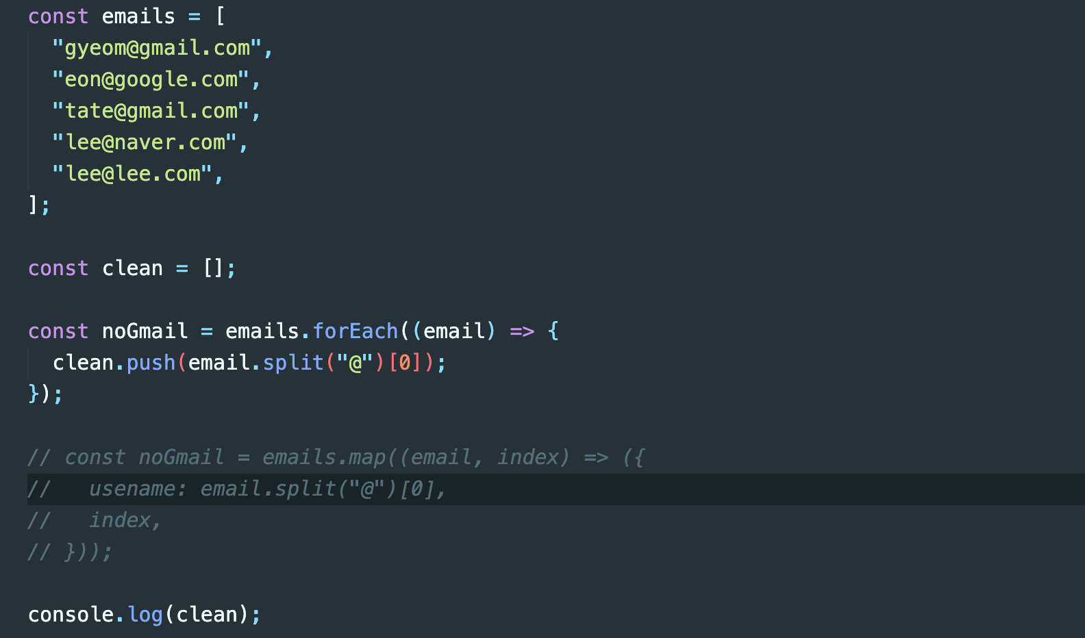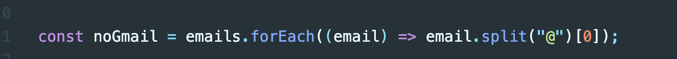 forEach함수를 써서 인자를 받아 @를 기준으로 스플릿 하고 0번째 인덱스 요소를 clean이라는 배열에 다시 넣어주는