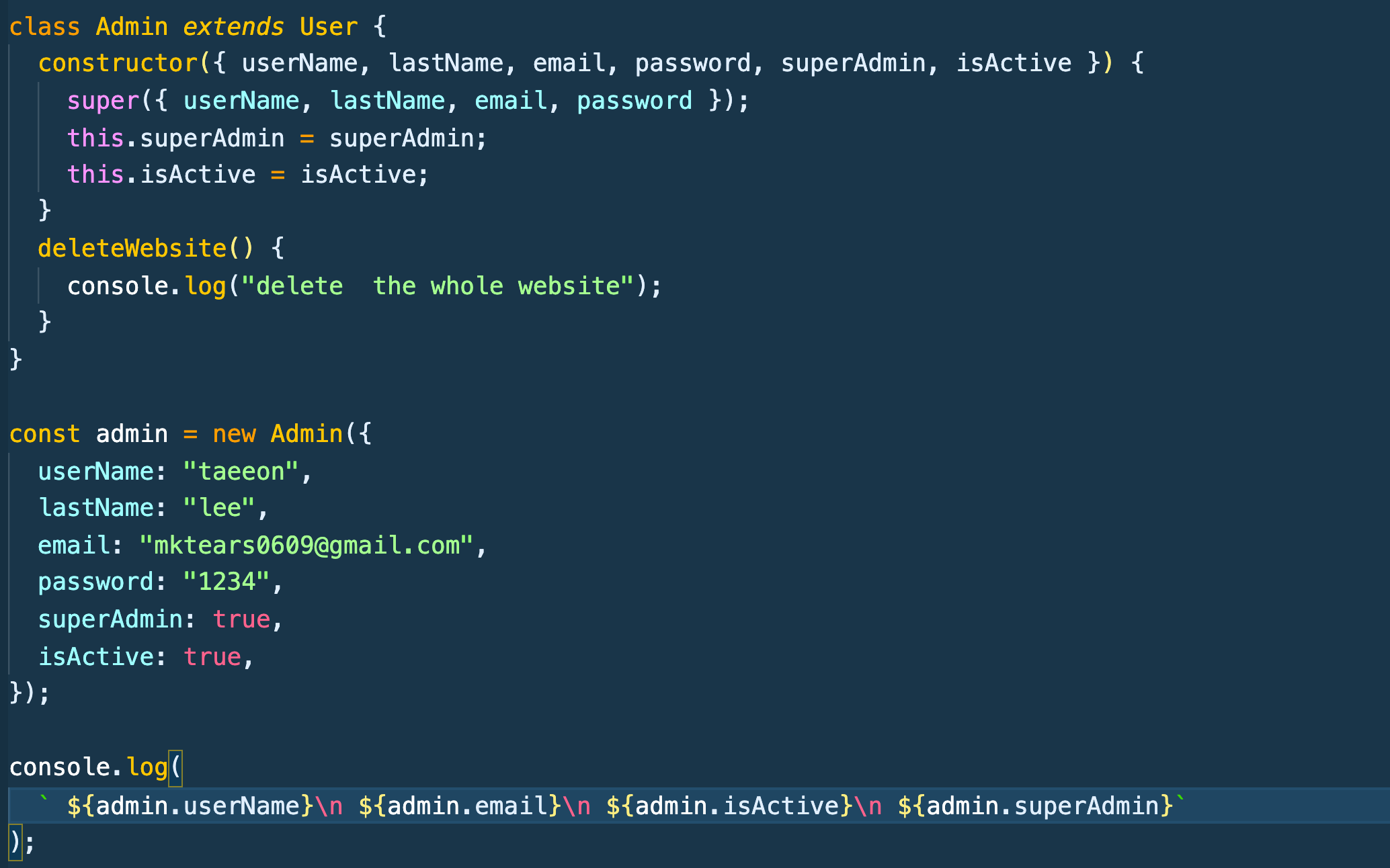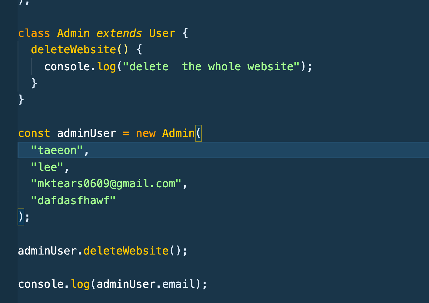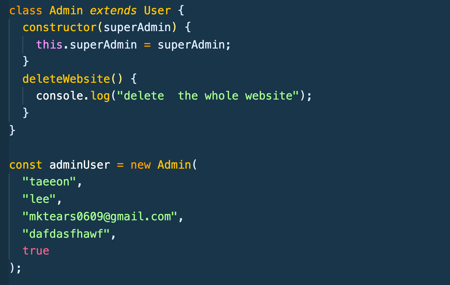 자 Admin 클래스를 만들어주는데 extends User를 해주면 된다. 그리고 그 안에 함수 하나를 작성 해주겠다.