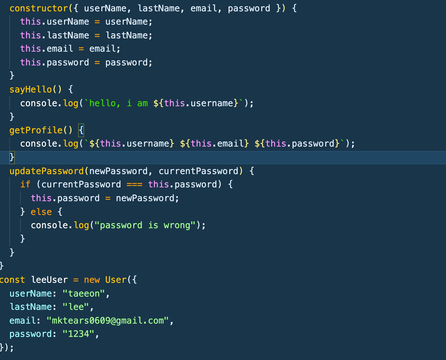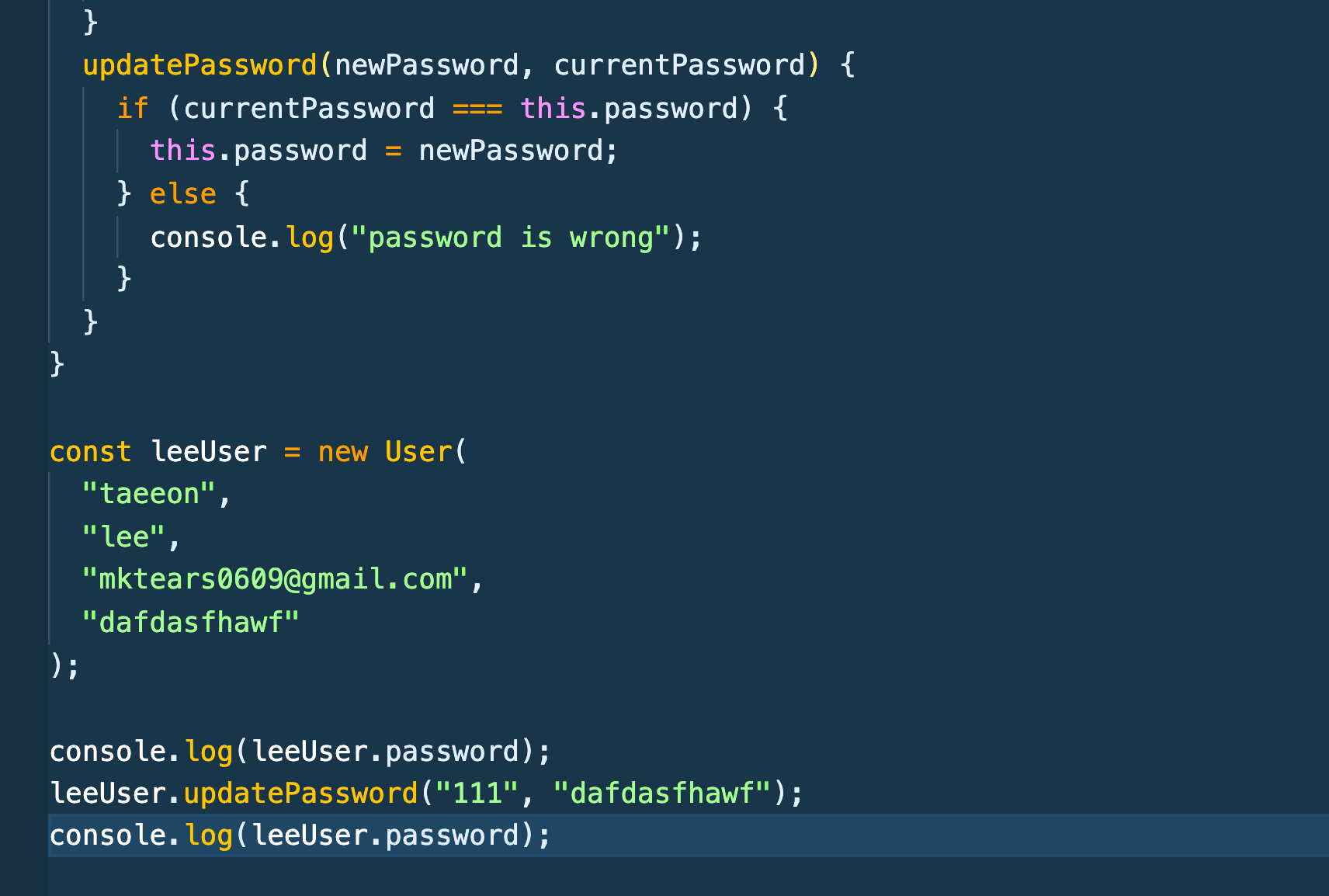 이렇게 만든 정보를 수정도 가능하다. updatePassword라는 함수를 만들어서 현재 패스워드가 먼저 정의된 패스워드와 같으면