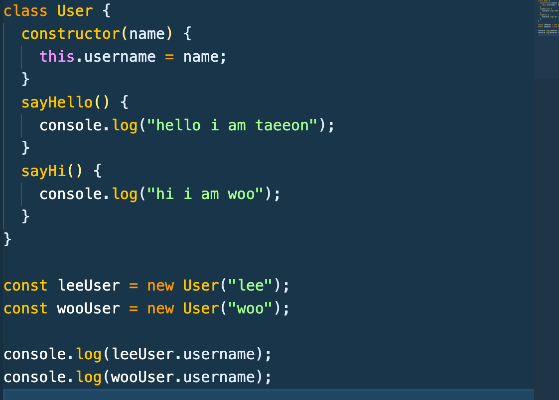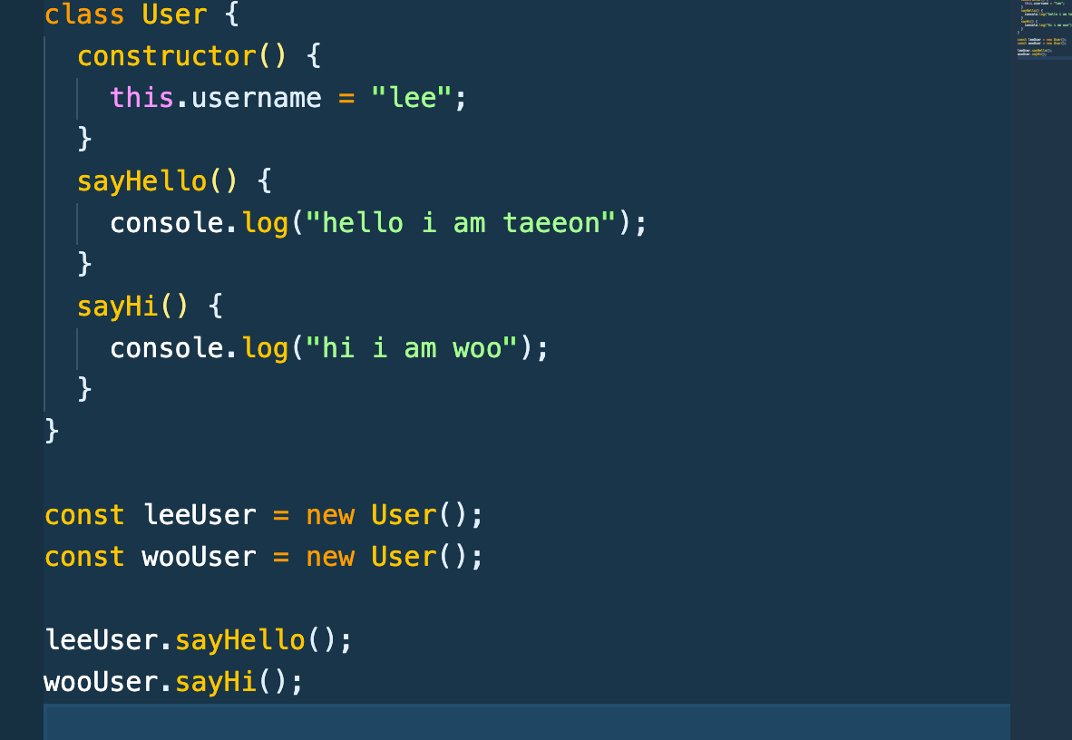 leeUser, wooUser라는 instance를 생성해주고 각각 sayHello, sayHi 함수를 호출해 주면 저렇게 결과를 띄워준다.