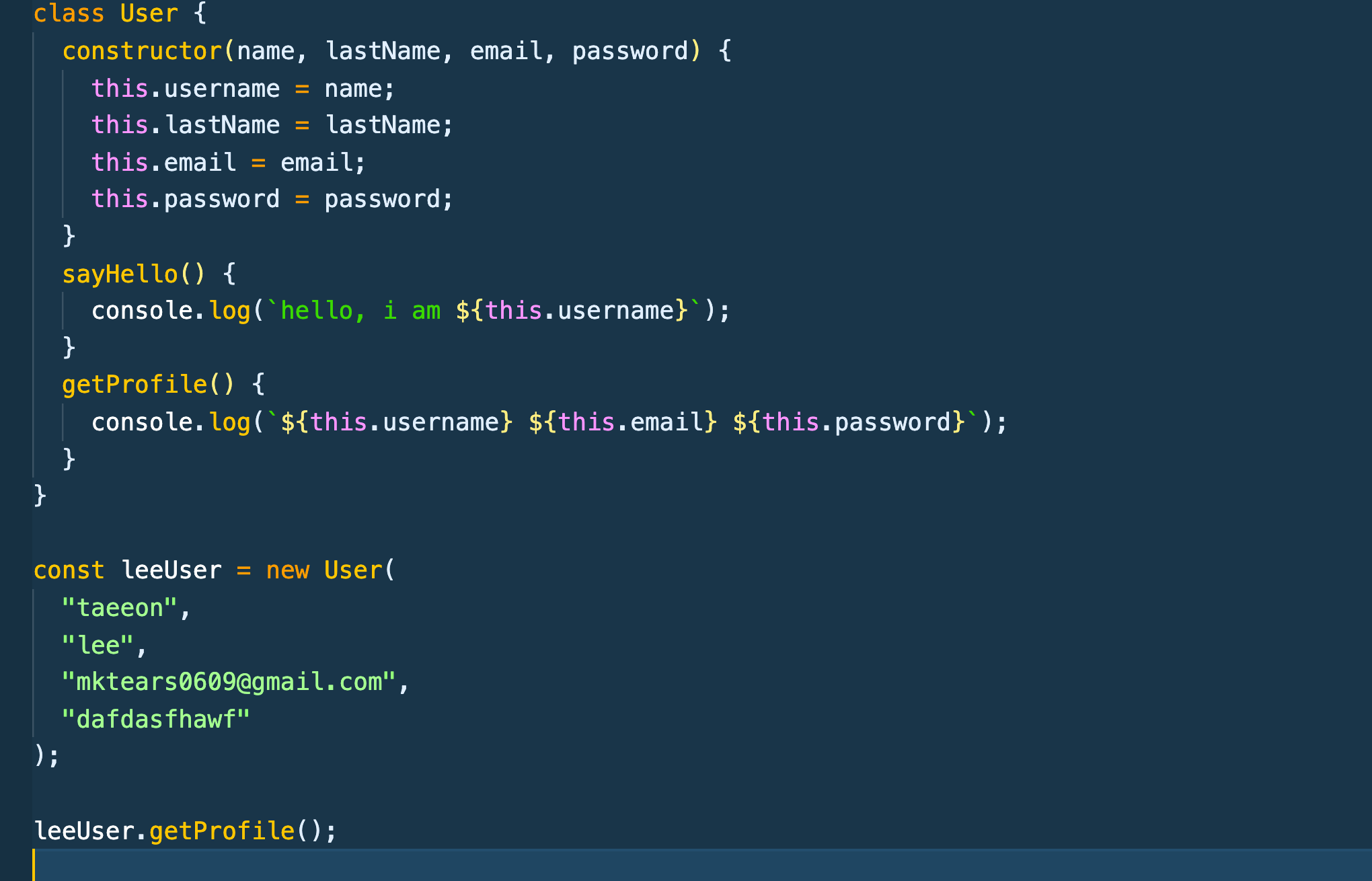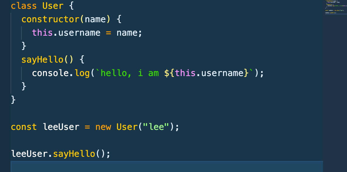 템플릿 리터럴을 통해 this.username을 넣어주고 인스턴스로 함수를 실행하면 이렇게 결과가 나온다~ lee가 username에 들어가고