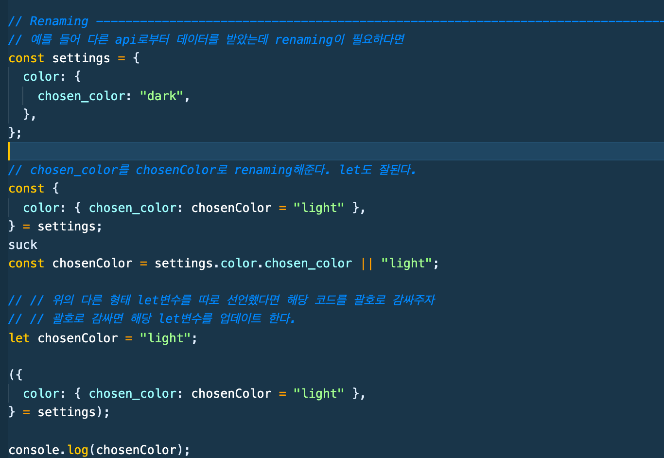 혹은 새로운 변수를 선언하여 기존 destructuring에 괄호만 감싸주면 다시 할당이 된다.
