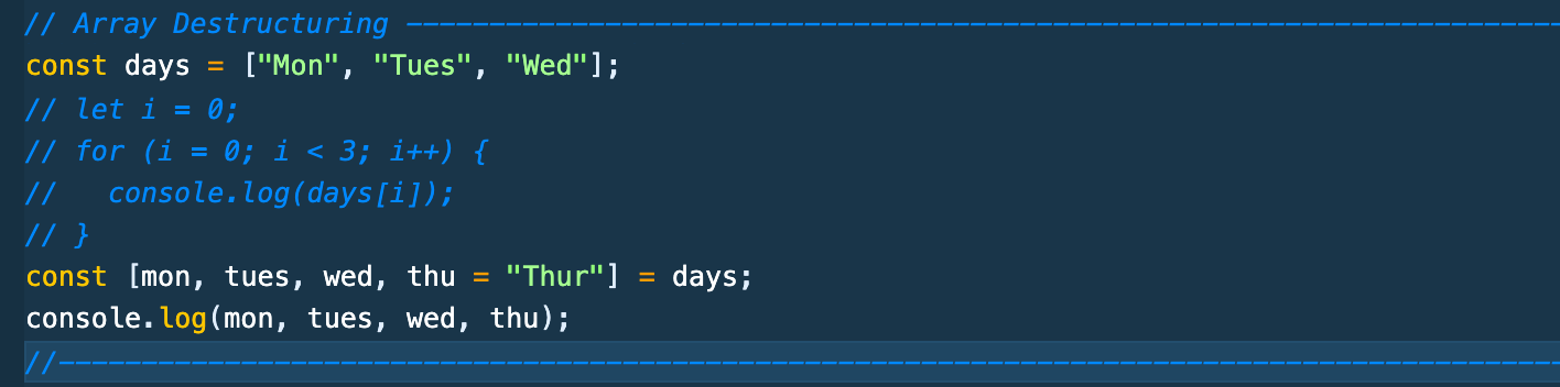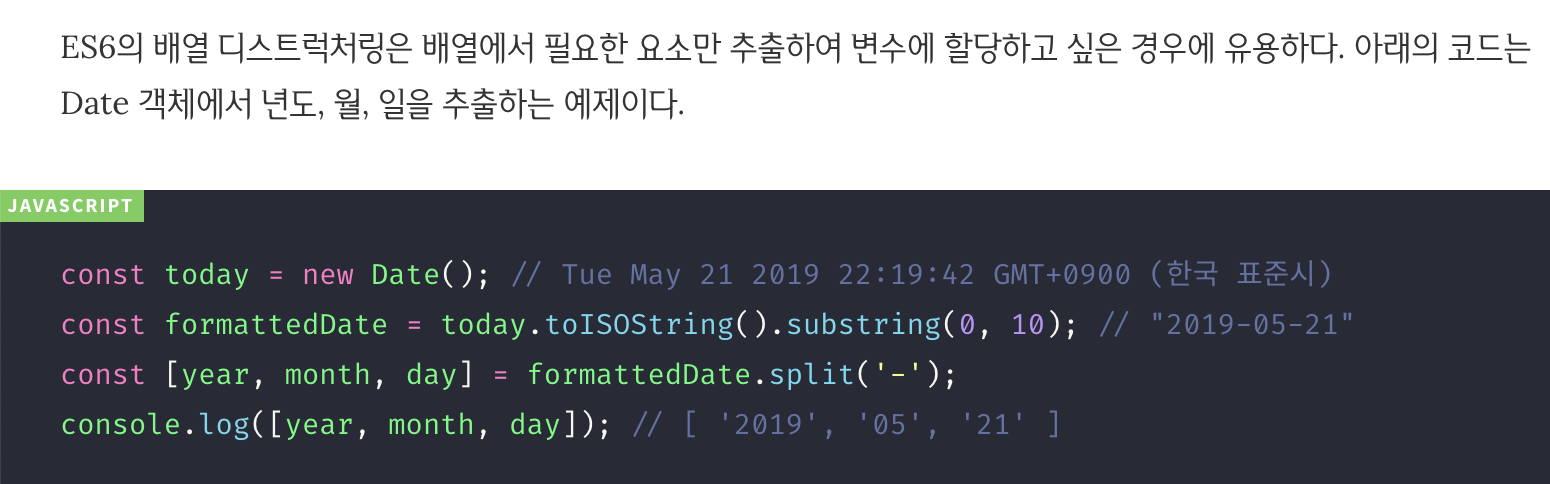 쉽게말해 object나 array같은 구조 안의 요소들을 변수 바깥으로 빼내서 사용할 수 있도록 하는것이다.