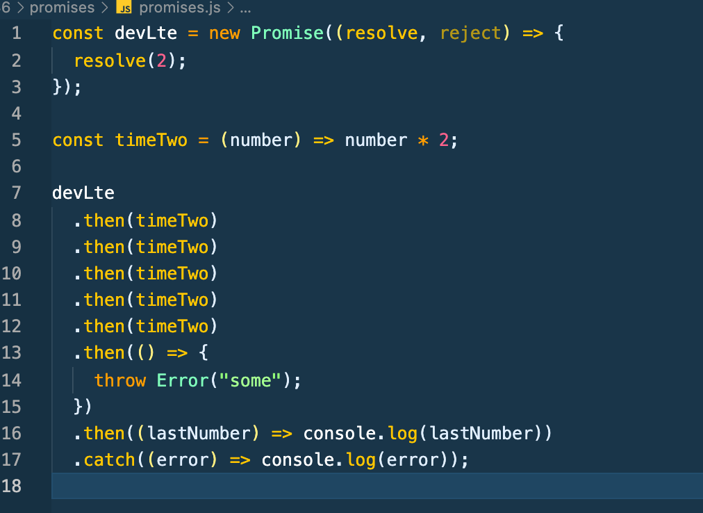 resolve가 성공적으로 완료되면 2*2를 콘솔창에 띄워주고 이것이 또 완료되면 넘겨받은 값에 *2를 해준다.