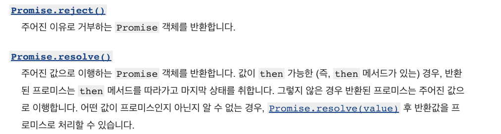단어 그대로 reject는 거부하는 객체 반환이며, resolve는 이행하는 객체를 반환.