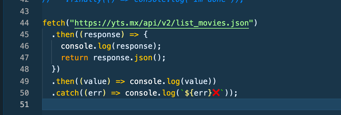 json은 console.log하면 또다른 promise가 발생해서 err가 발생하니 response만 콘솔출력해주고 response.json()의 promise를 리턴해준뒤