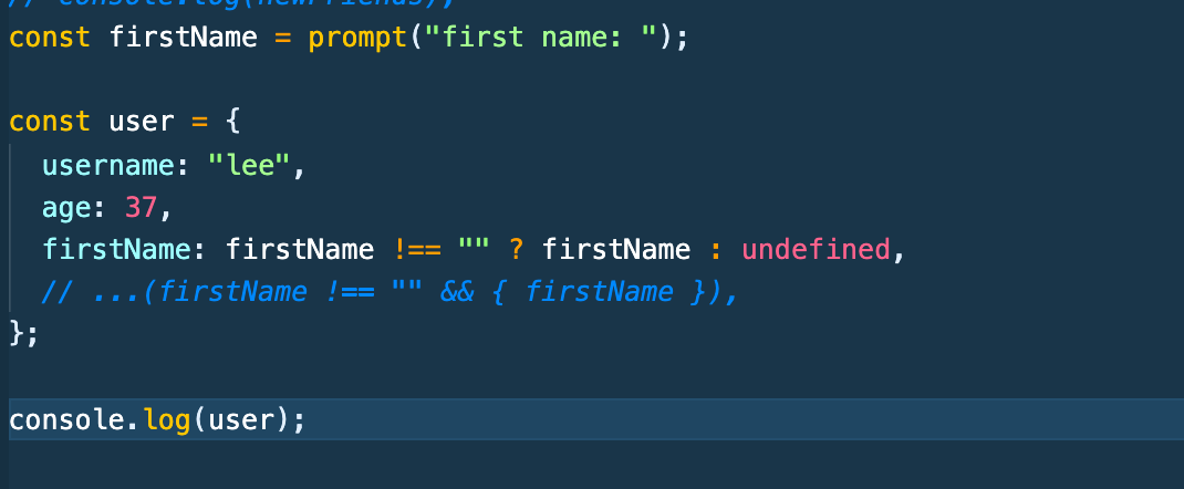 예를 들어 user라는 object가 잇을때 prompt창을 통해 입력밭은 결과를 추가하고 싶다면