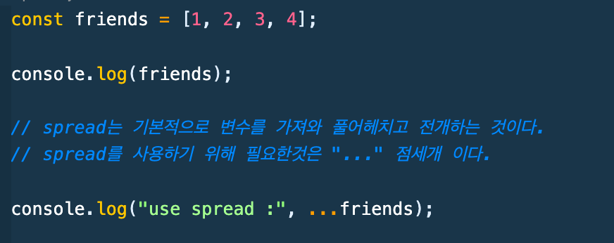이렇다.. 그냥 콘솔에 찍어보면 저 배열 그대로 배열임을 나타내지만 spread는 배열을 나타내는 []를 표시 하지 않고
