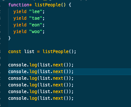 자 하나 만들어보자 기본적으로 function*이렇게 선언하고 return 대신에 yield문을 써준다.