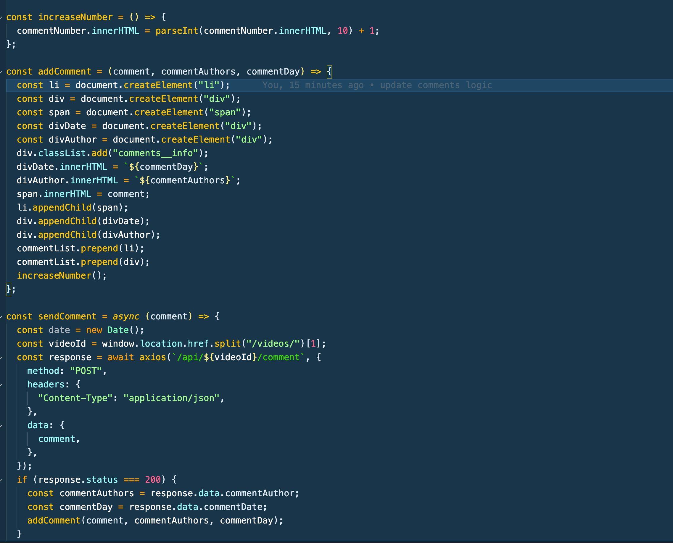 axios를 이용해 보내준다. 그리고 comment.text를 넣어주자 creator 와 createAt.toLocaleString()으로 작성자와 시간도 넣어줬다.