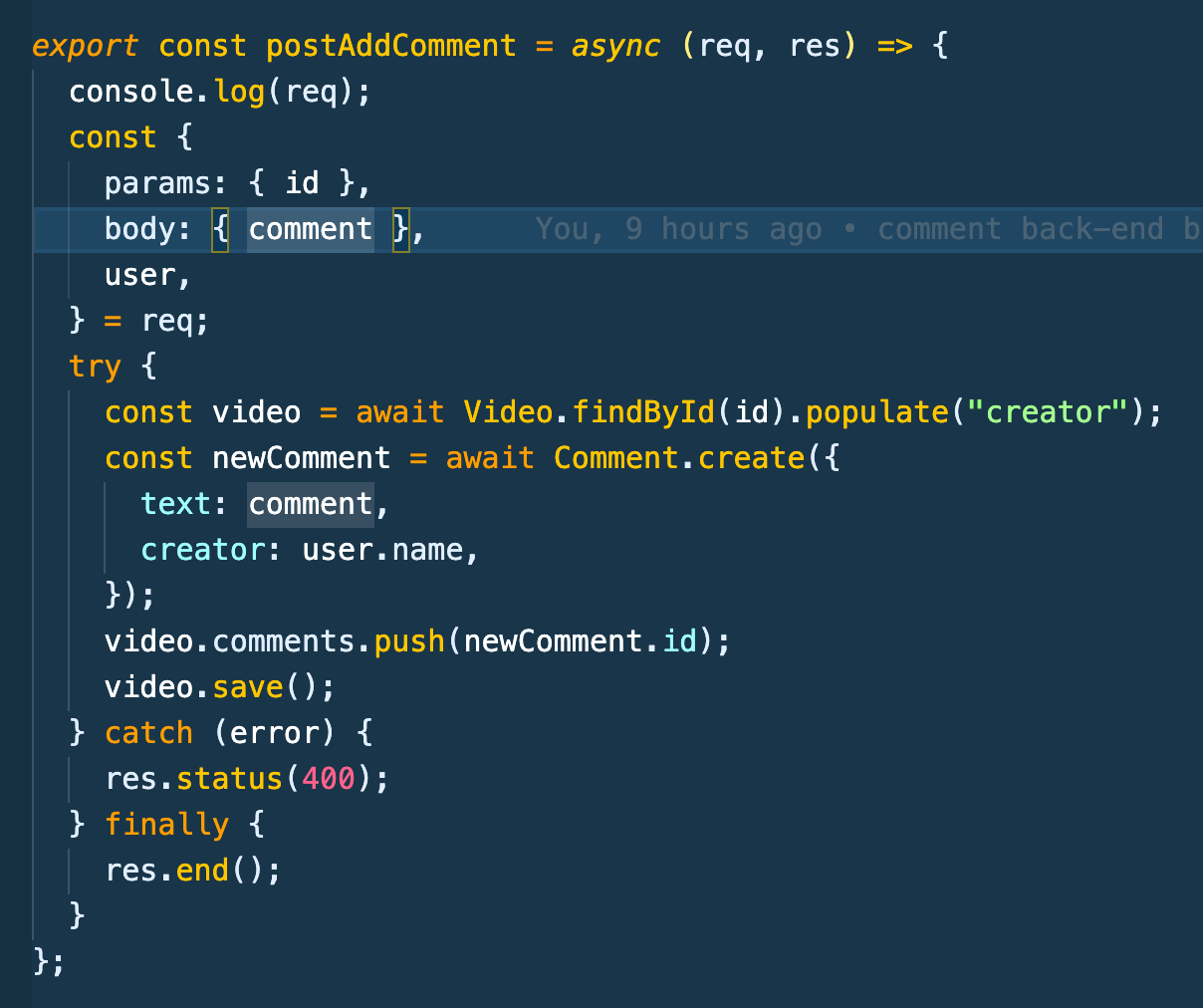root를 설정해주러 routes.js에서 api part에 url 설정을 해주고 videoController에서 postAddComment컨트롤러를 만들고