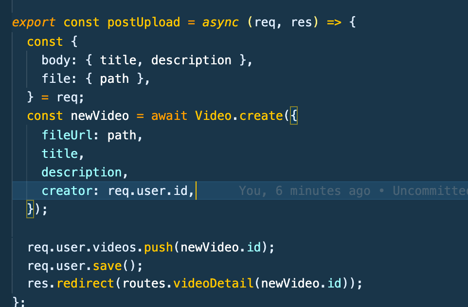 새로 만들어진 비디오의 스키마 creator를 req.user.id를 추가해주고 (유저가 로그인 되어있다면 항상 req에는 user가 있다)