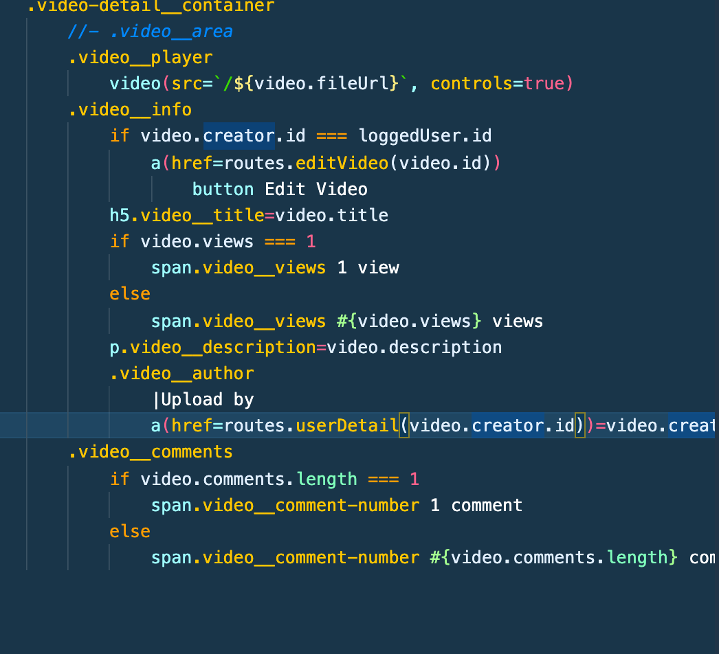 작성자 정보를 띄워준다. 이때 routes.js에 작성된 userDetail() 라우트함수에 video.creator.id를 넣어 정보를 가져오도록 해주자.