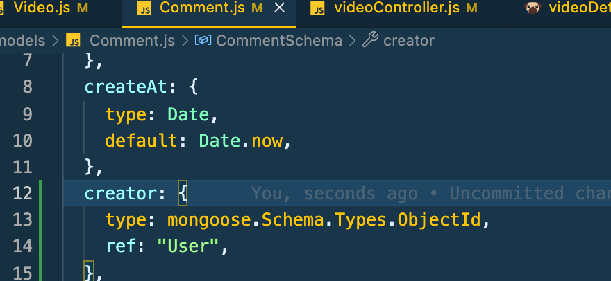 먼저 각 모델에 스키마를 추가한다. 비디오에는 유저의 정보를 그리고 유저에는 비디오와 코멘트 정보, 코멘트에는 유저의 정보를 넣어주자