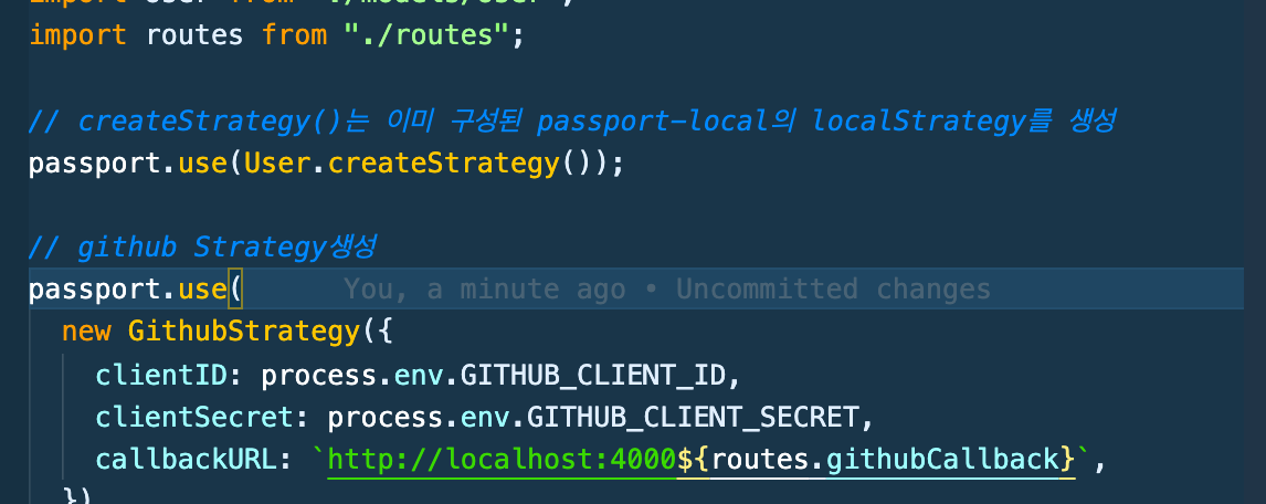 이렇게 만들었으니 이제 passport로 가서 routes를 임포트하고 callbackUrl을 변경~ 뭐 안해도 되지만 라우트를 썼으니 써주자
