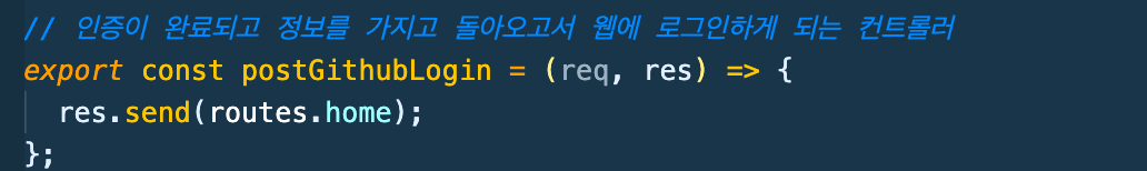 로그인 과정이 성공적이고, 이 함수가 문제없이 결과를 리턴하면 PostGithubLogin 컨트롤러를 실행해 홈화면으로 보내준다.