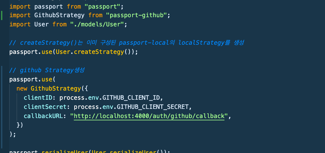passport-github을 임포트하고 github strategy를 생성한다. passport 사이트를 참조해서 한다.