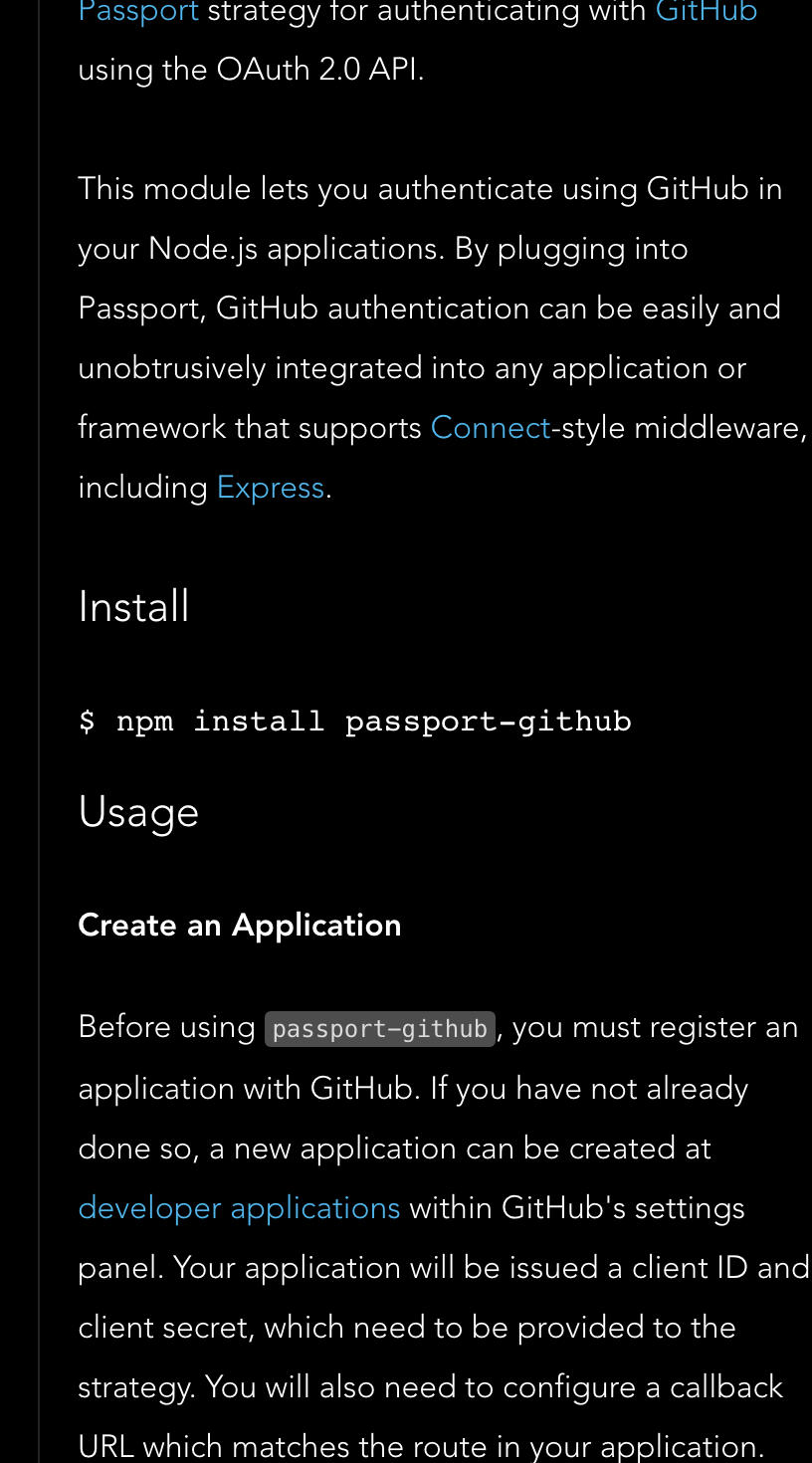 자 다음 섹션을 보면 passport-github을 이용하기 전에 깃헙에 앱을 등록해야 한다~