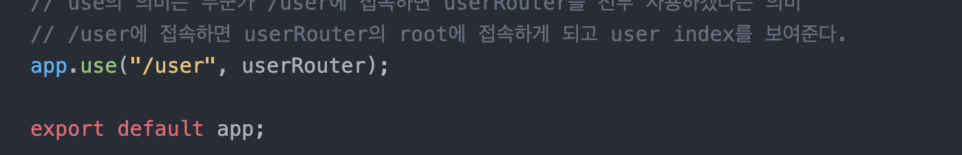자 풀이를 하자면 /user라는 경로에 접속(use)하면 userRouter를 이용하겠다? 라는 거다.