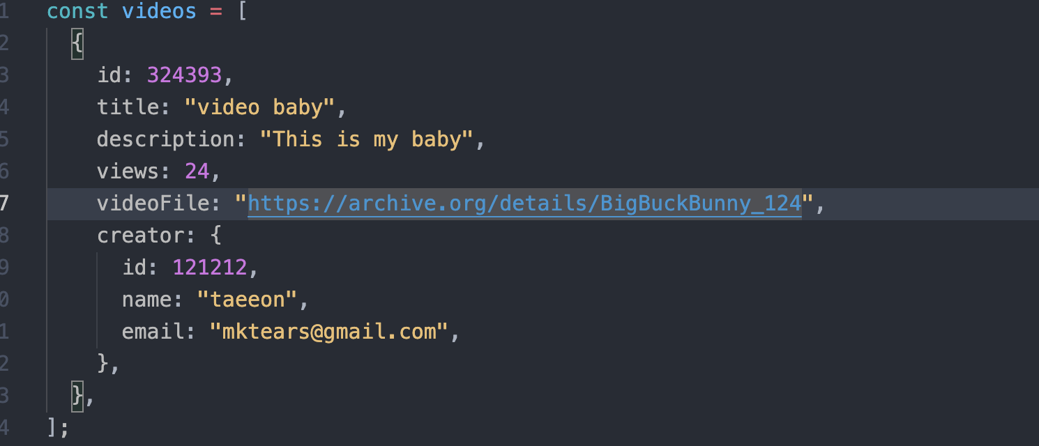 db.js를 만들어주고 안에 videos라는 배열을 만든다. (가짜 데이터를 통해 테스트하는 방식을 연습하자 데이터베이스에 무엇을 추가할지 설정하기 전에 빠르게 수정이 가능하다)