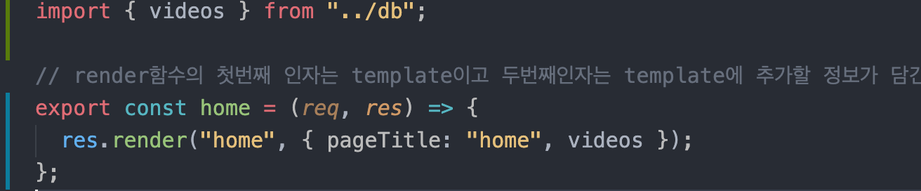 이제 홈화면에서 이것을 뿌려야 되니 videoControllers에 home컨트롤러에서 video목록을 받아 render함수에 전달한다.