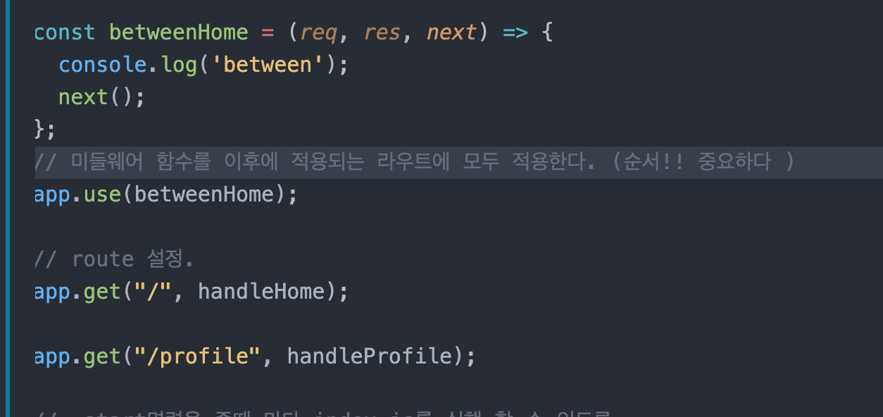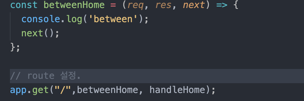미들웨어 함수 betweenHome을 만들어 줬다. 매개변수에는 req객체와 res객체 next(다음으로 엑세스할 함수)