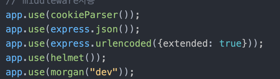 쿠키파서 실행하고 바디파서로 읽어들이고 헬멧으로 보안해주고 마지막으로 모간으로 모든 로그 확인.