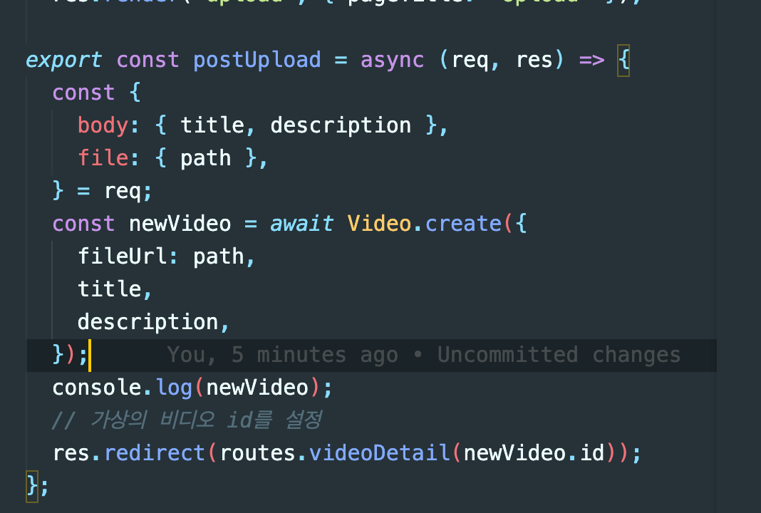컨트롤러로 가서 역시 postUpload컨트롤러도 async - await을 사용해서 비디오를 읽어온 다음 다음 랜더링을 진행하도록 해주고