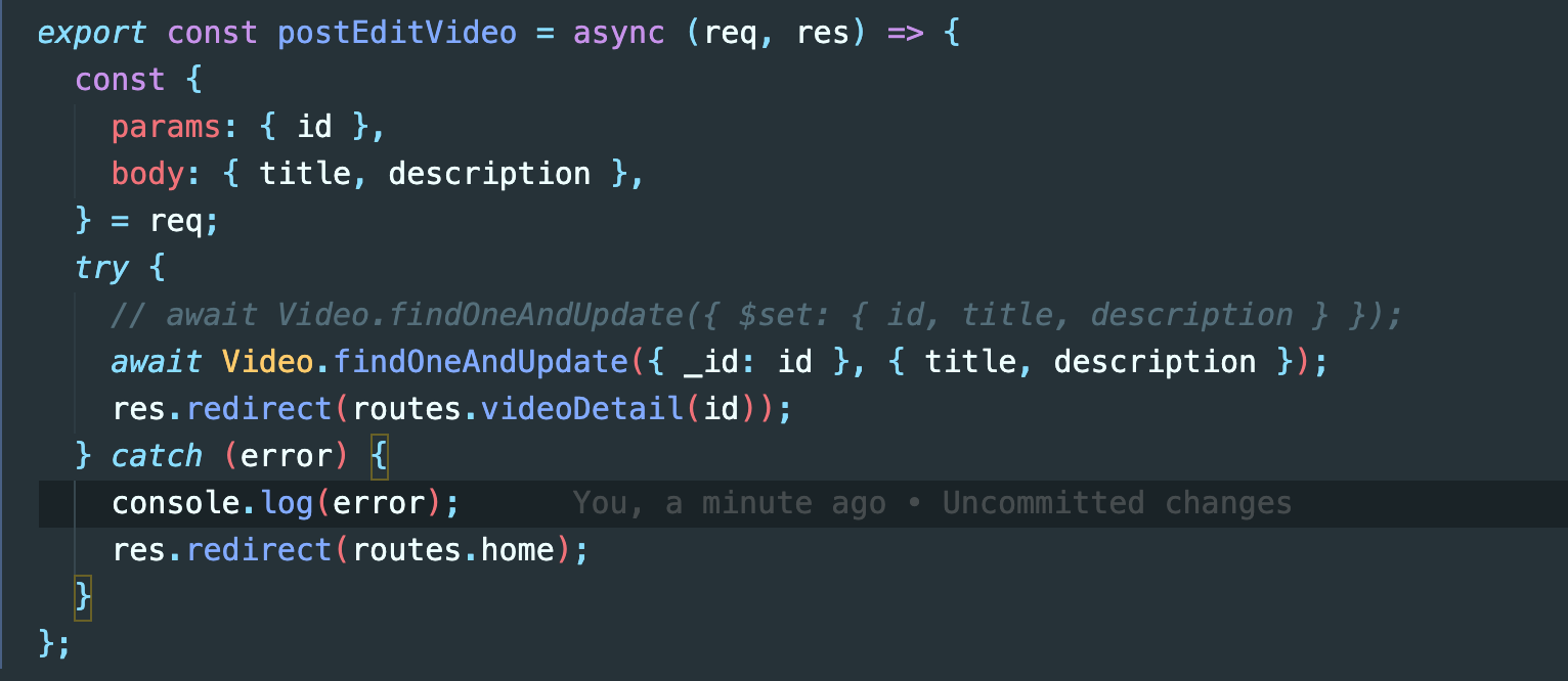그리고 Video모델에 findeOneAndUpdate() 쿼리문을 통해 request아이디의 타이틀과 세부사항을 업데이트 해주고서