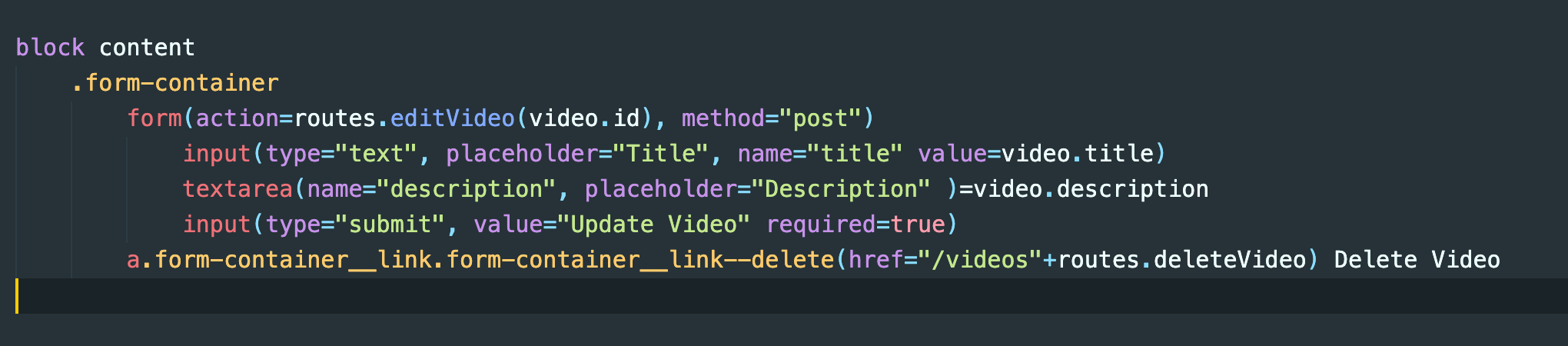 그리고 editVideo 템플릿에 라우트도 수정해주고 수정페이지에 들어오면 기존 세부사항과 타이틀이 남아있게 하기 위해 박스에 벨류를 추가해준다.