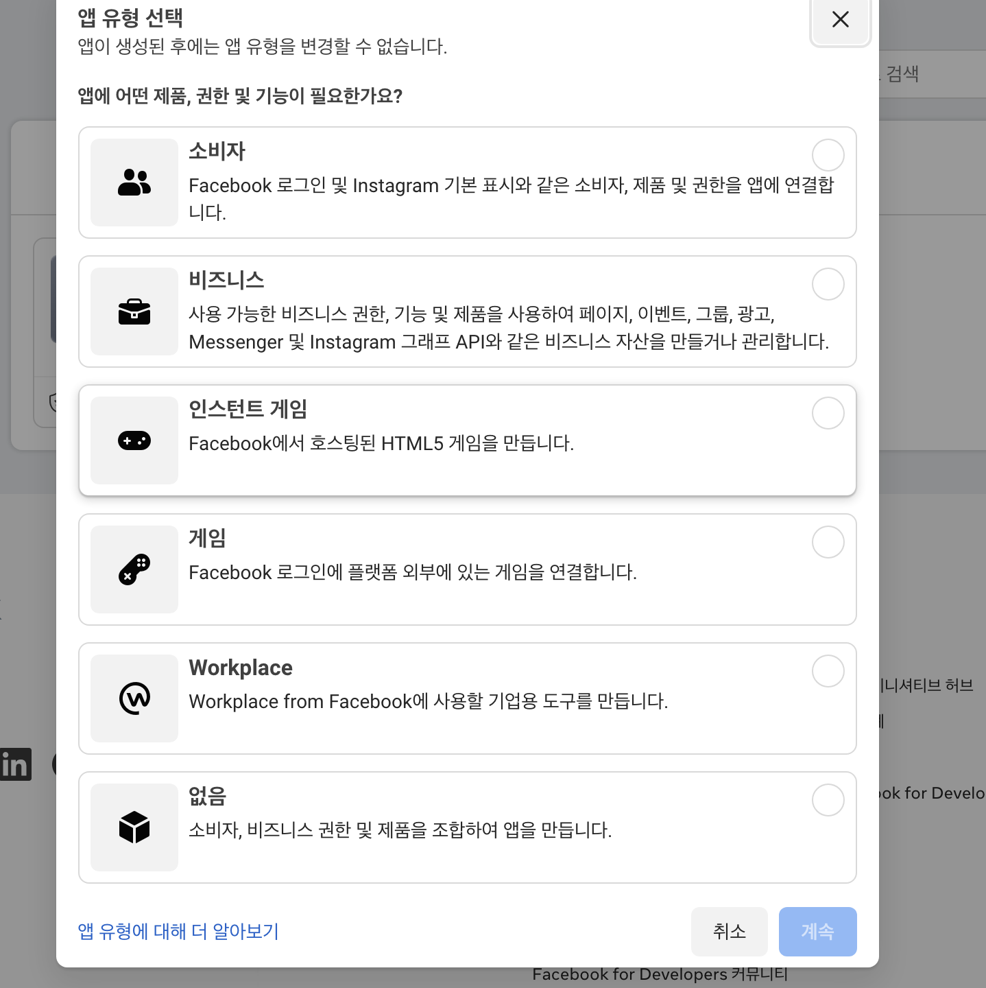 그리고 facebook 로그인 설정을 선택하고 계속 계속~