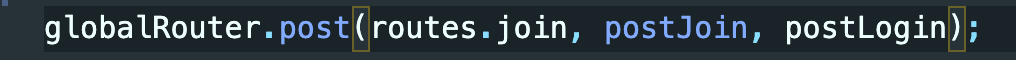 여기서 postJoin의 매개변수에 next를 넣어서 미들웨어로 만들어 줬다. 회원가입을 하며녀 바로 로그인이 되도록 하기 때문에