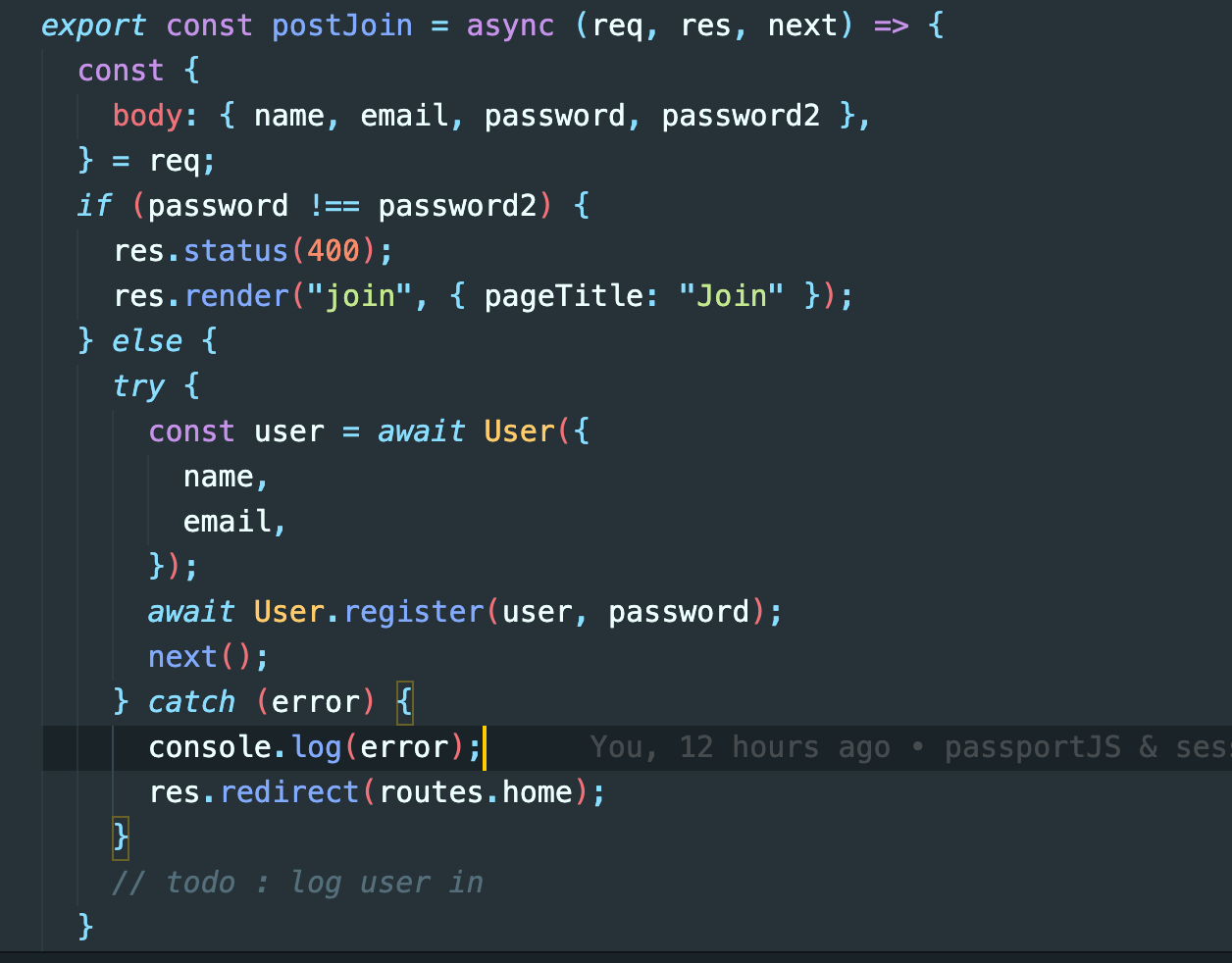 여기서 postJoin의 매개변수에 next를 넣어서 미들웨어로 만들어 줬다. 회원가입을 하며녀 바로 로그인이 되도록 하기 때문에