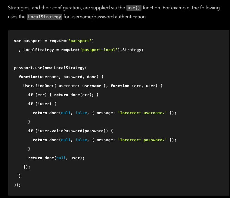 아래는 사용자 인증방식의 strategy를 구현한 모습이다. 이걸 createStrategy로 간편히 사용한것