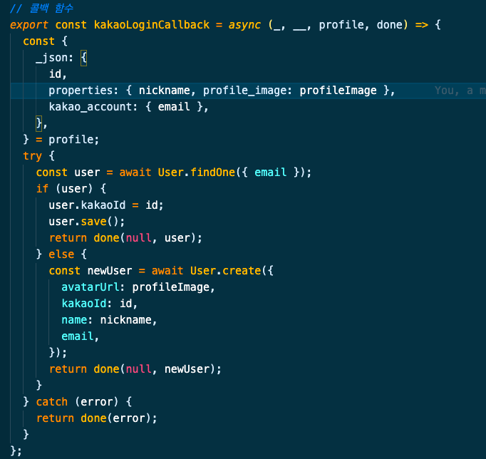 중요한 콜백함수를 만들어 준다. 역시 4개의 매개변수가 있다. done은 내가 잘못 이해햇었는데 역시 passport의 callback함수이다.