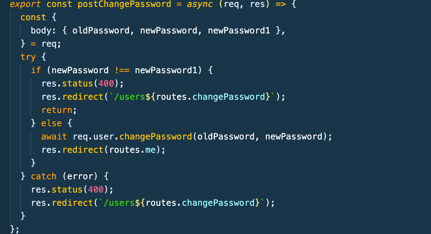 만약 두개가 일치하면 local-mongoose 의 인스턴스 함수로 현재 함수와 바뀔 함수를 바꿔준다. 그리고 프로필페이지로 이동