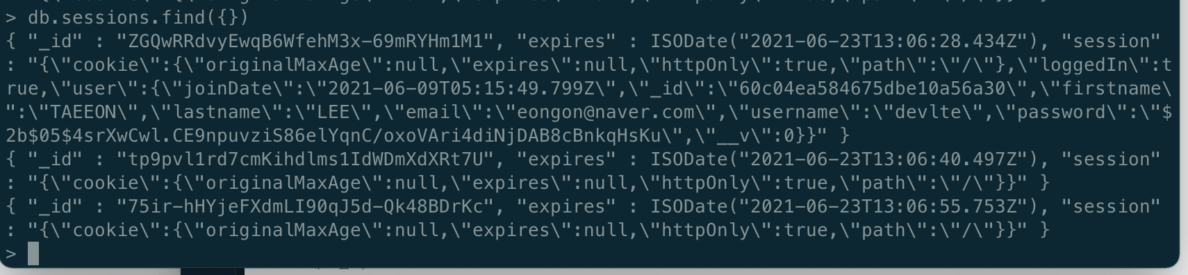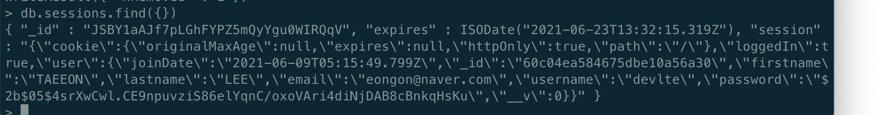 그리고 db의 sessions 컬렉션과 브라우저의 쿠키를 삭제해주고 refresh!