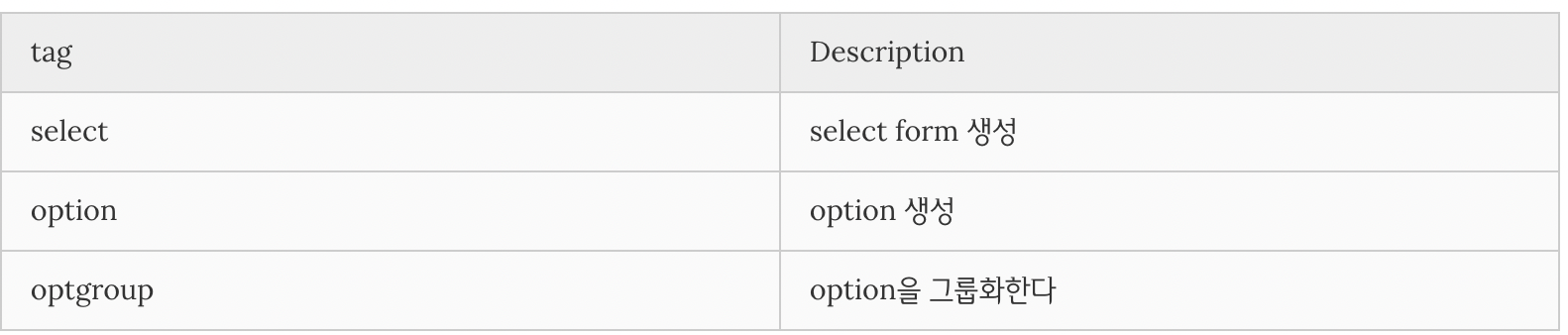 select, option, optgroup등의 태그로 함께 사용가능하다.