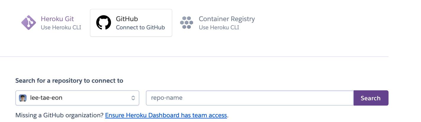 깃헙을 클릭해주고 내 깃헙계정과 연결후 레포지토리를 검색해주자.