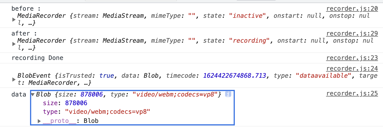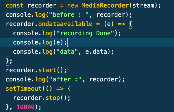 이제 recoder 를 전역 설정하고 stop은 stop 핸들러에 넣고 돌려주면 data를 얻을 수 있다.
