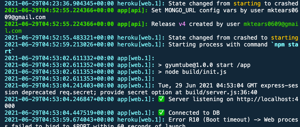 다시 에러가~~~ 60초 동안 web process가 port와 연결하는데 실패했다고 한다. heroku가 서버에 열어준 port와 연결되지 않았다고 하는 말이다.
