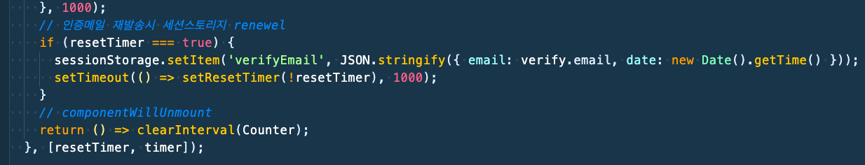 먼저 만들어둔 verifyEmail state에 담아주고 setInterval 함수를 이용해 가입시점 + 1분과 현재의 시간 차이를 구해서